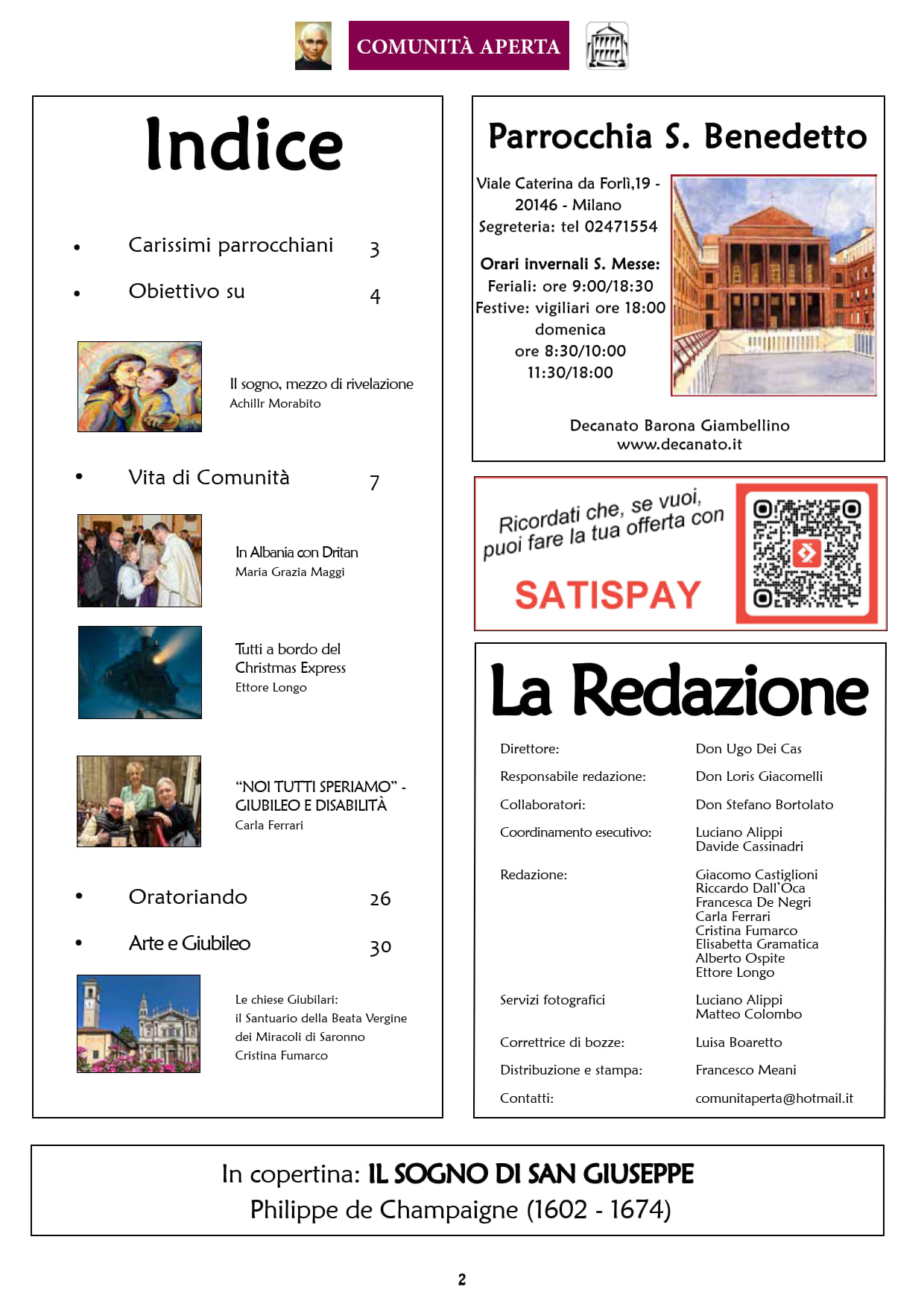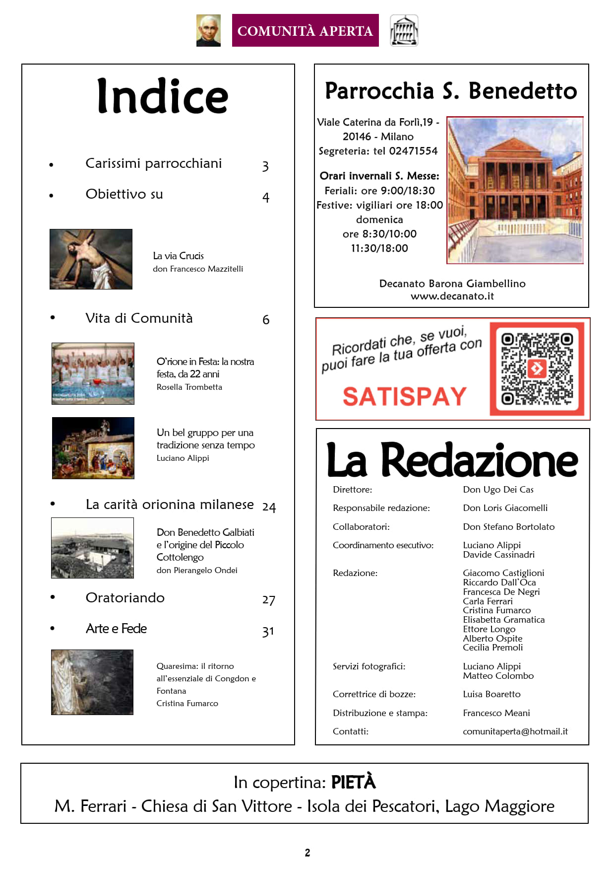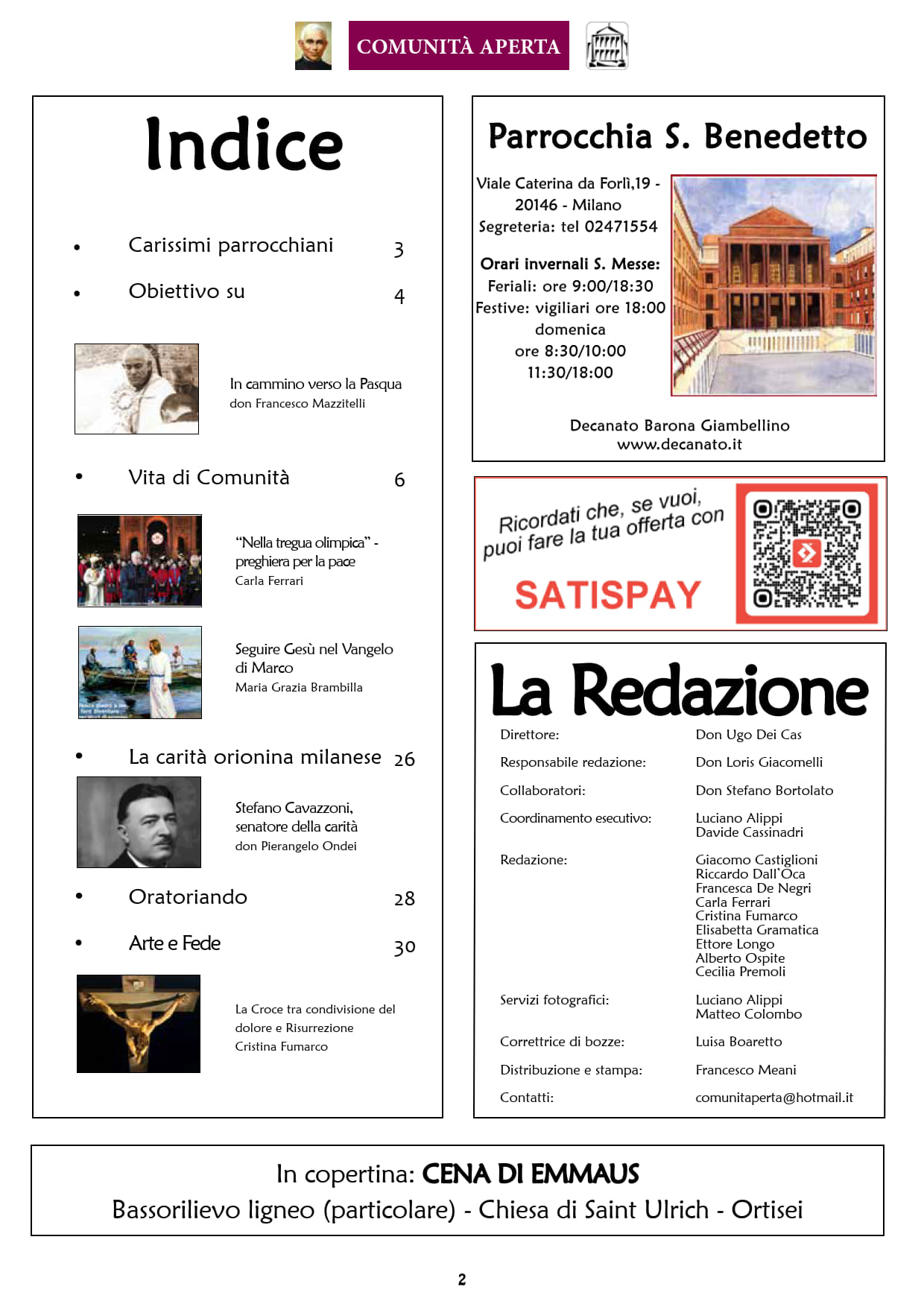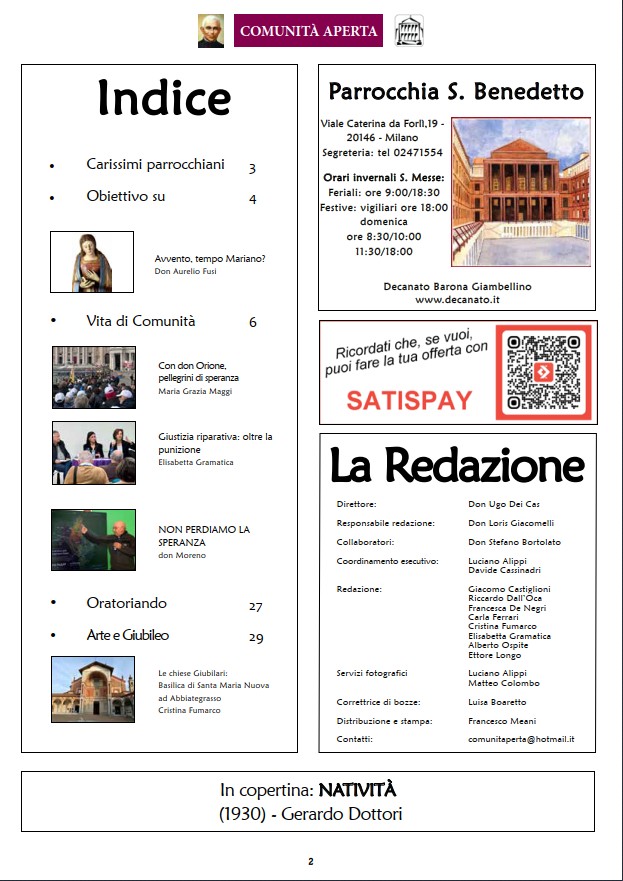 E’ il giornale ufficiale della nostra parrocchia, fondato da don Mascalin, secondo parroco di San Benedetto. Nel corso dei vari decenni, con pochissimi momenti di pausa, la rivista ha continuato ad informare i parrocchiani sugli eventi della vita di comunità. Naturalmente si sono avvicendate varie presenze nel gruppo redazionale; ad oggi una decina di persone, tra giovani e adulti, è impegnata nel compito di portare avanti le “uscite” mensili del periodico. Lo scopo del giornale è soprattutto quello di aggiornare costantemente la comunità sulle iniziative parrocchiali; oltre a questo, ogni numero contiene approfondimenti religiosi, spirituali e culturali su varie tematiche. Autori degli articoli sono, per la maggior parte dei casi, i parrocchiani, oltre che i nostri sacerdoti. L’intento è quello di incentivare un dialogo continuo, il nome stesso del periodico dice la finalità che anima il lavoro di redazione: essere una realtà APERTA al dialogo, per favorire la vita della COMUNITÀ.